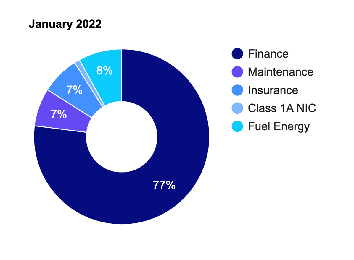 The pie charts below are based on the TCO from a basket of 15 vehicles for each powertrain. Based on Contract Hire Full Maintenance with a contract term of 36mths / 20,000 miles per annum. Fuel costs are based on 75% business miles using Advisory Fuel Rates (AFR’s) and PHEV MPG figures have been reduced by 75% to reflect real world conditions. Finally, this TCO is effective from April 2022 – inclusive of the Health and Social Care Levy.