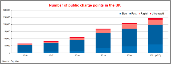 But let’s start in the present. As of September 2021, the UK’s public charging network currently consists of about 26,000 devices, with a total of over 41,000 connectors in over 16,000 locations. This represents a 270% increase over the past five years.