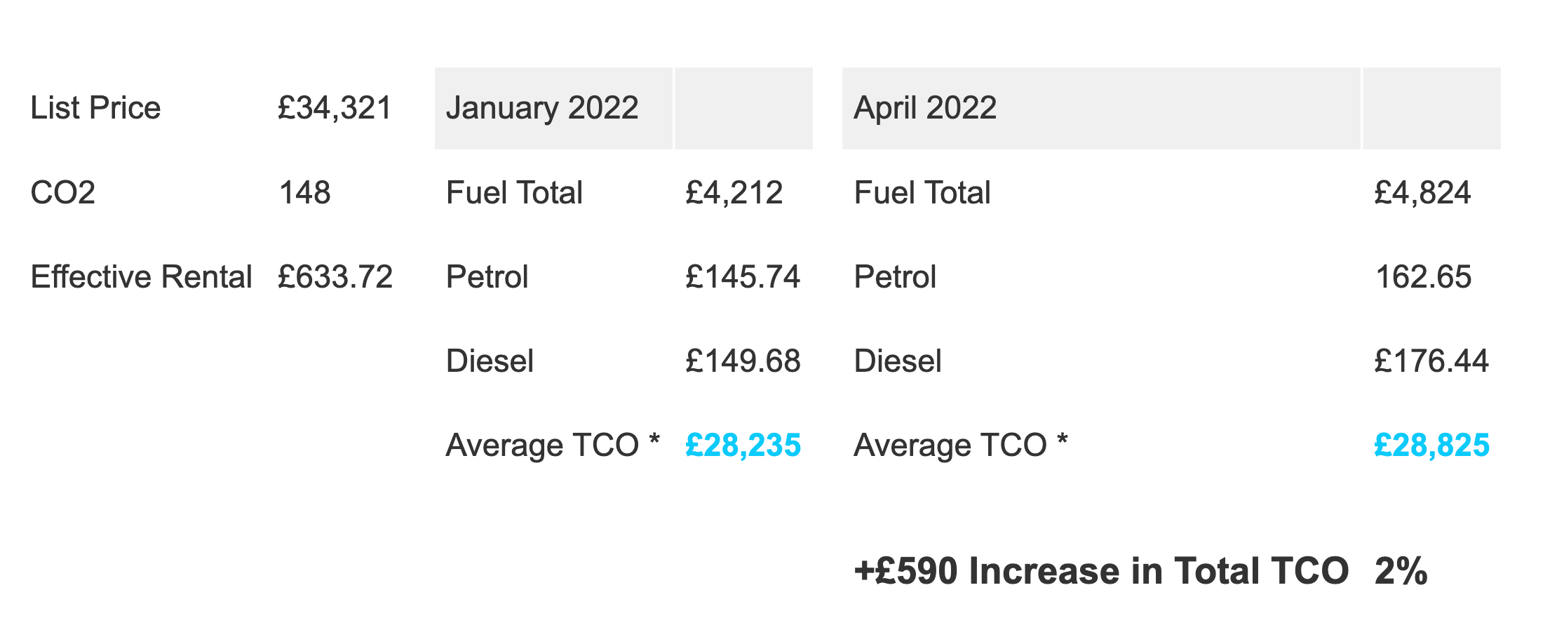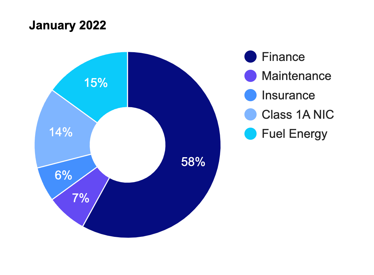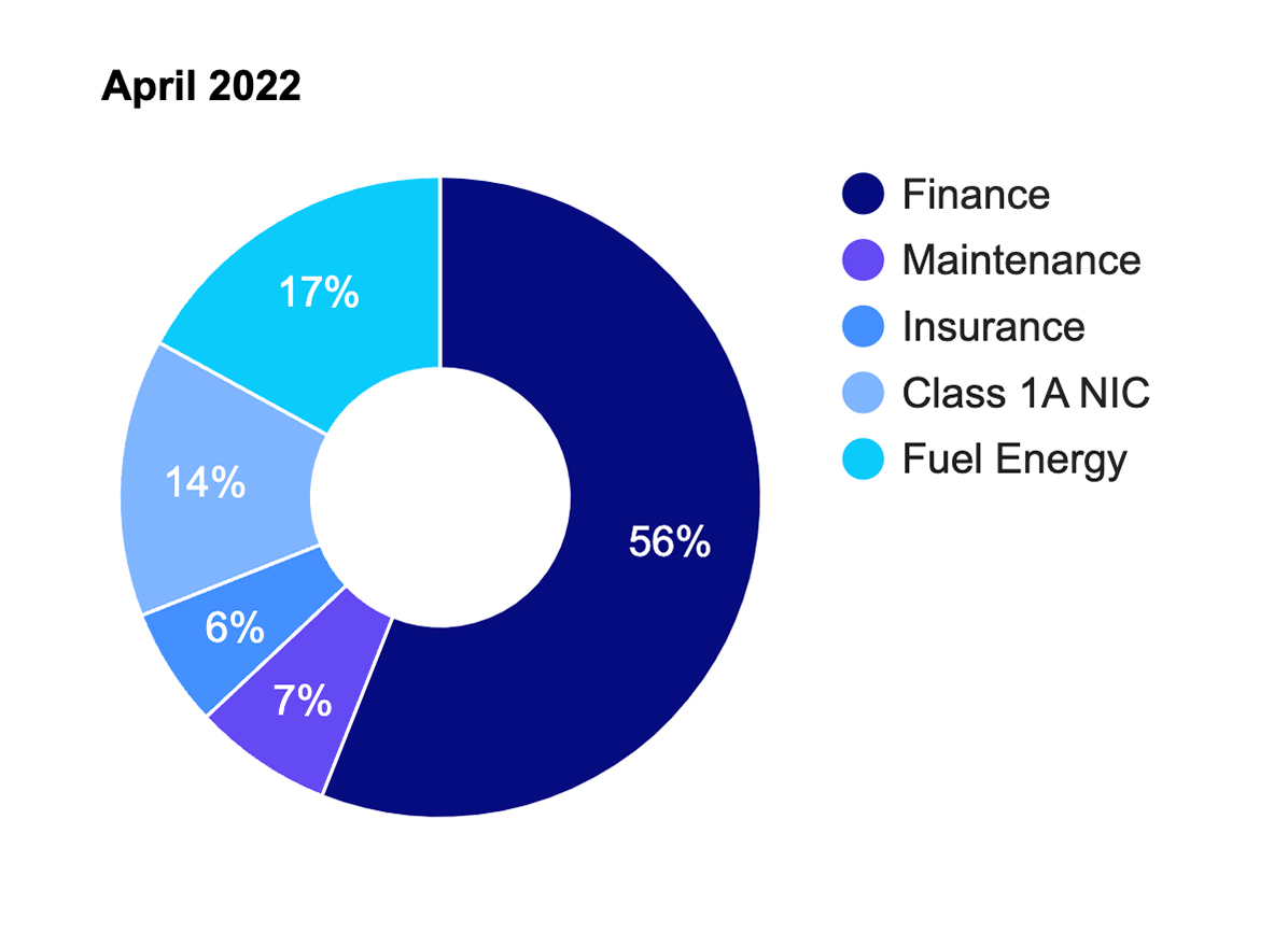 The pie charts below are based on the TCO from a basket of 15 vehicles for each powertrain. Based on Contract Hire Full Maintenance with a contract term of 36mths / 20,000 miles per annum. Fuel costs are based on 75% business miles using Advisory Fuel Rates (AFR’s) and PHEV MPG figures have been reduced by 75% to reflect real world conditions. Finally, this TCO is effective from April 2022 – inclusive of the Health and Social Care Levy.